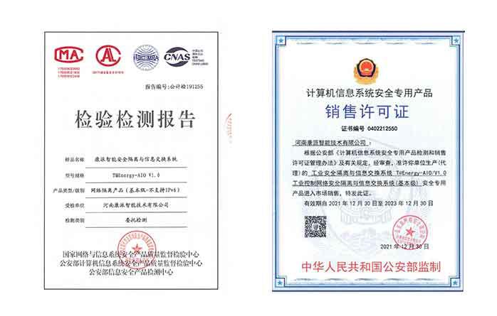 能耗在线监测端设备按照GB/T20279《信息安全技术网络和终端设备隔离部件安全技术要求》的相关规定,通过第三方认证,同时取得了《公安部技术机信息系统安全产品质量监督检验中心检验报告》和《计算机信息系统安全专用产品销售许可证》。