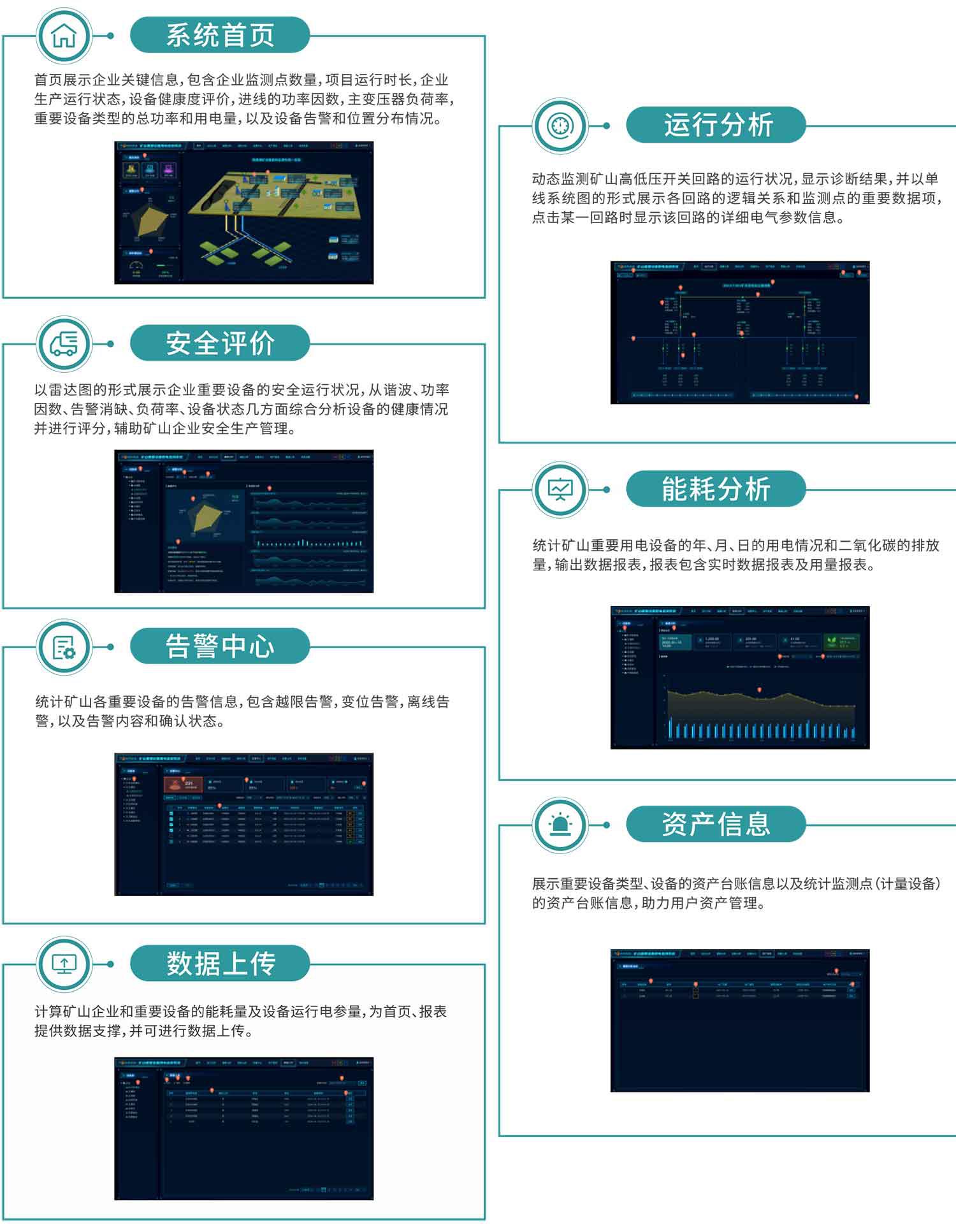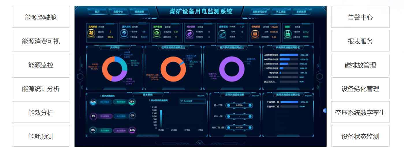 根据《煤矿及重点非煤矿山重大灾害风险防控建设工作总体方案》要求,自主研发的矿山(煤矿)重要设备用电监测系统,帮助煤矿行业能耗体加强能源消耗日常调度、提升能源管理精细化水平、开展能源审计、审查以及节能改造投资等提供决策支撑服务。