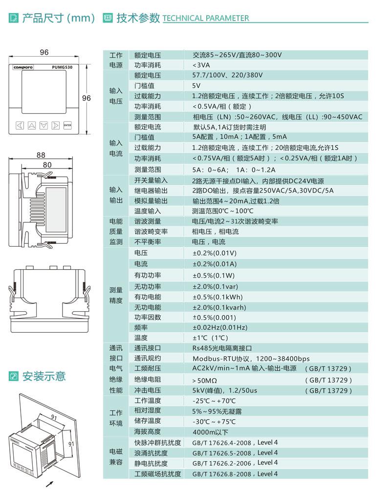 PUMG530系列三相智能电力仪表具有精确的电力参数测量功能,仪表采用先进的ARM处理器和数字信号处理技术设计而成;集三相电参量测量、显示、电能统计、电能质量分析、数字输入/输出及网络通讯于一体;具有精度高、隔离性强、性能稳定、抗干扰能力强等优点。该仪表还有很强的扩展功能,如监视外部开关动作、4~20mA模拟量输出,还可以通过RS-485通讯实现仪表的网络化管理。