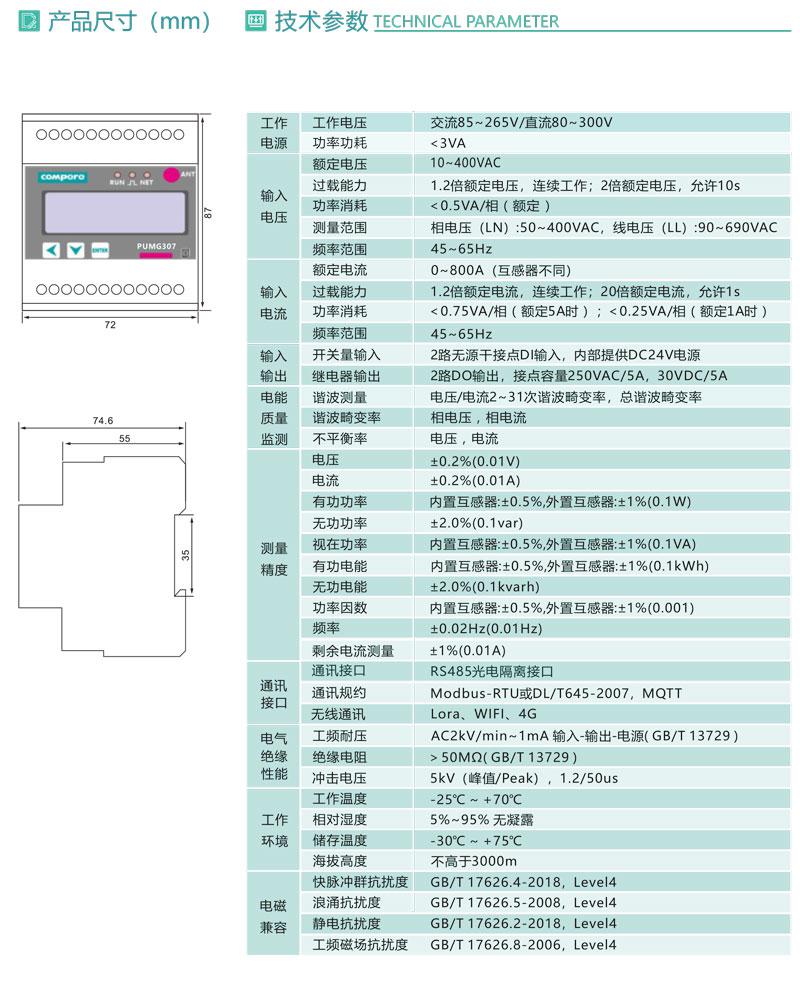 PUMG307系列三相导轨式智能电力能效终端采用DIN35mm 导轨式安装结构和LCD液晶屏显示,集三相电参量测量、2~31次谐波分析、时间统计等于一体,标配1路RS485通讯接口,可通过Modbus-RTU或DL/T645-2007通讯协议实现仪表的网络化管理。还可扩展2路开关量输入 和2路 继 电 器 输 出 , 可 外 接 开 口 式 互 感 器 易 于 改 造 项 目 的 施 工 。PUMG307具有体积小巧,精度高,可靠性好,安装方便等优点,多用于系统集成、改造工程、安装空间有限或不便的项目。