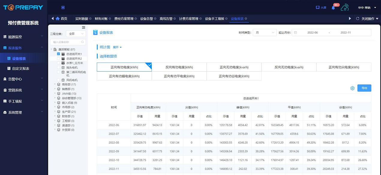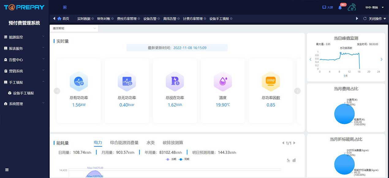 用户和管理员可查询权限范围内的预付费表或管控表用能状况,可提供能耗分析+财务轨迹一体式综合管理报表,方便用户及管理员进行用能分析与财务报表管理。