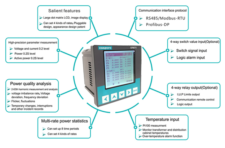 KPM75 is a new generation high-end power quality analyzer that follow international power quality standards and monitor all power quality parameters such as flicker, short interruptions in recorded voltage, and harmonic up to 63 measurements with power data Statistics, IO signal control alarm, communication and other functions. Large graphic LCD display, pluggable function module design, widely used in key power applications, it is the ideal choice to monitor the distribution operation efficiency.