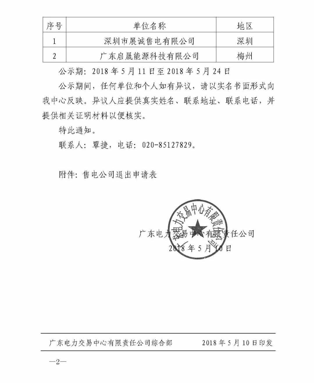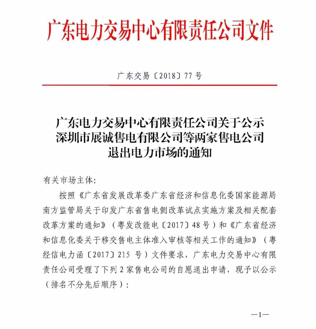 广东电力交易中心日前发布了《关于公示深圳市展诚售电有限公司等2家售电公司退出电力市场的通知》,通知中称,收到两家售电公司退出电力市场的自愿退出申请,公示期为2018年5月11日至5月24日。这也是广东首例售电公司退出事件。