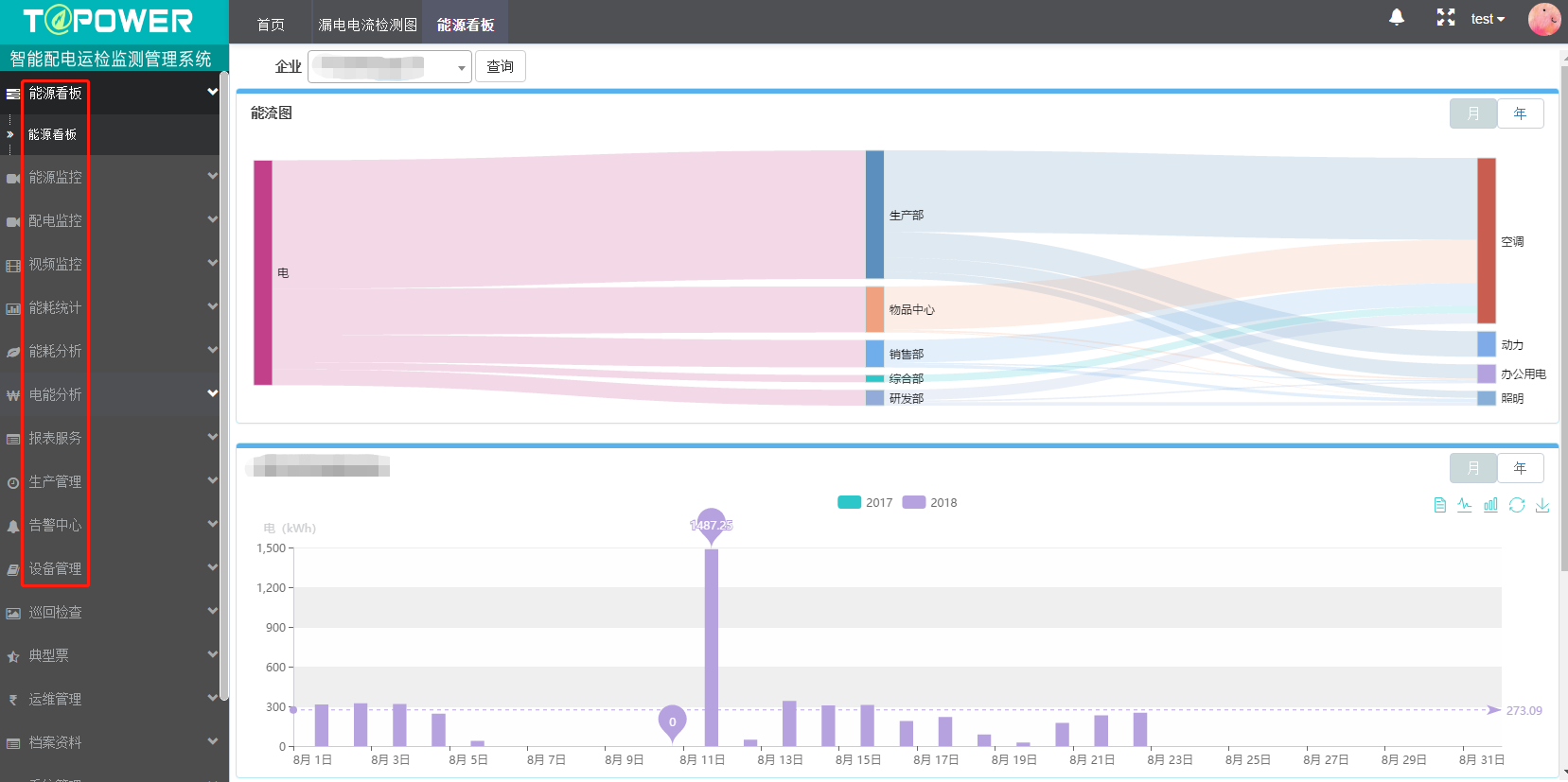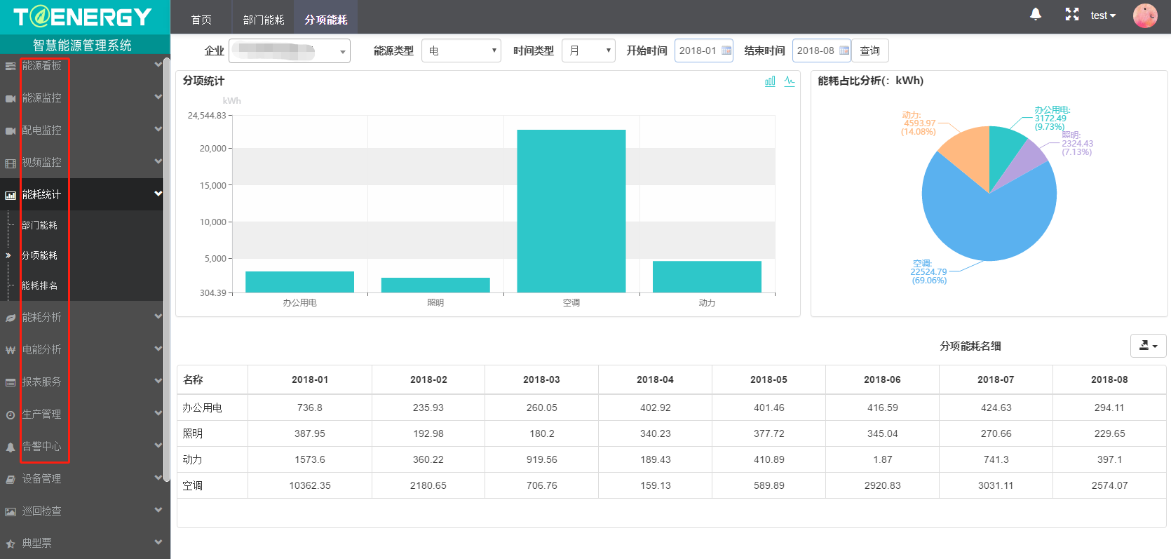能源管理系统采用先进的智能化集成技术,基于B/S架构、Mysql数据数据库,以及redis实时数据库的能源管理平台,该平台采集个能耗监测点(变配电、照明、空调、电梯、给排水、热水机组和重点设备)的能耗和运行信息,形成能耗的分类、分项、分区域统计分析,对能源的统一调度、优化能源介质平衡、减少煤气放散、提高环保质量、降低企业综合能耗和提高劳动生产率有重要作用,帮助客户更有效的使用能源,从而实现“节能管理、绿色能效”。