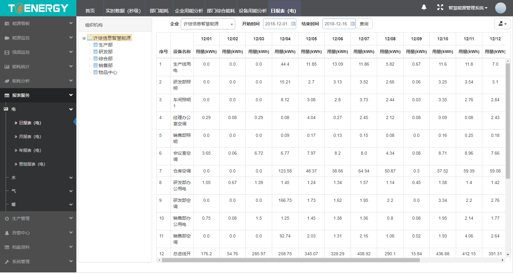 2.对各能耗设备的能耗数据进行统计分析与展现;并对用能趋势进行分析。