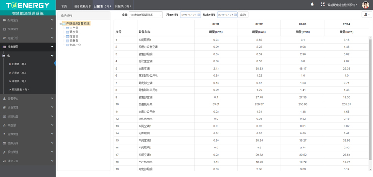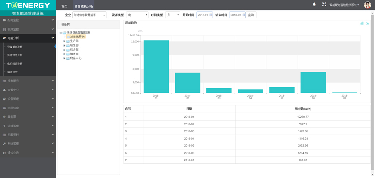 能耗分析包括企业用能分析、部门综合能耗、设备用能分析和电量指标综合分析这四类,将企业中各部门及各监测点实际用能情况,通过不同的分析方式展现出来。