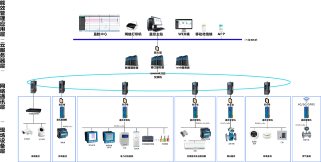 现场设备层负责电、水、气、暖和环境参数的采集与上传。现场设备层由多功能电力仪表、多功能电能表、智能水表、智能气表、温湿度传感器等采集装置组成。