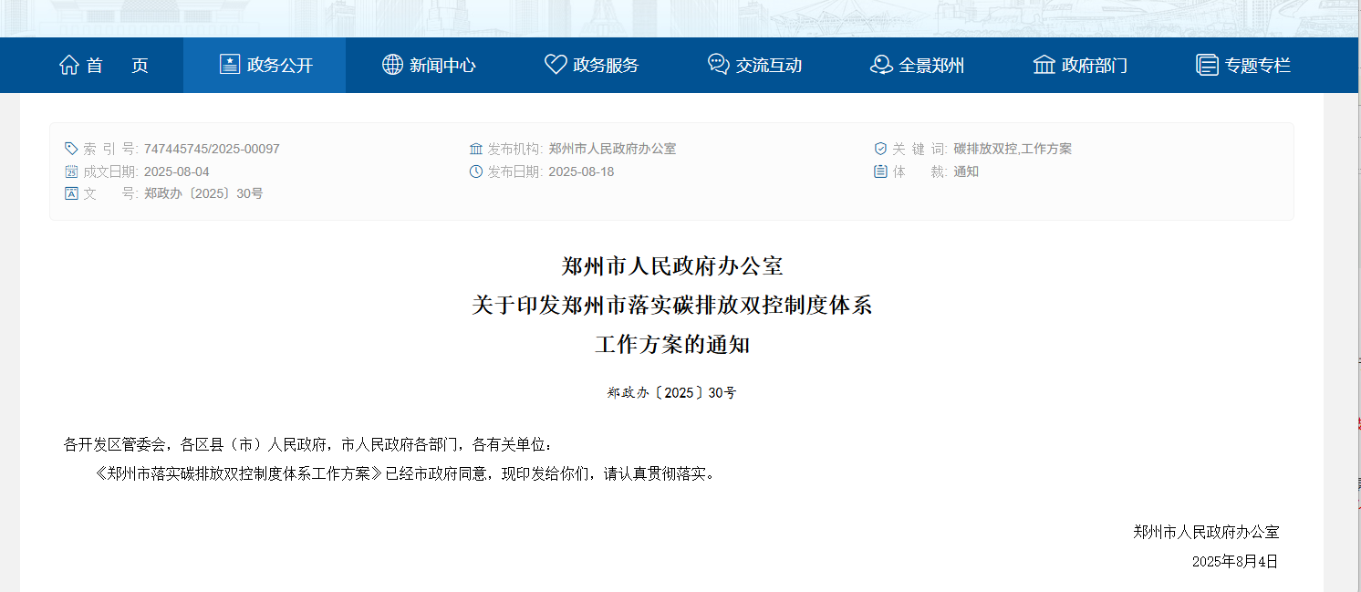 近日,郑州市人民政府办公室印发郑州市落实碳排放双控制度体系工作方案的通知。
